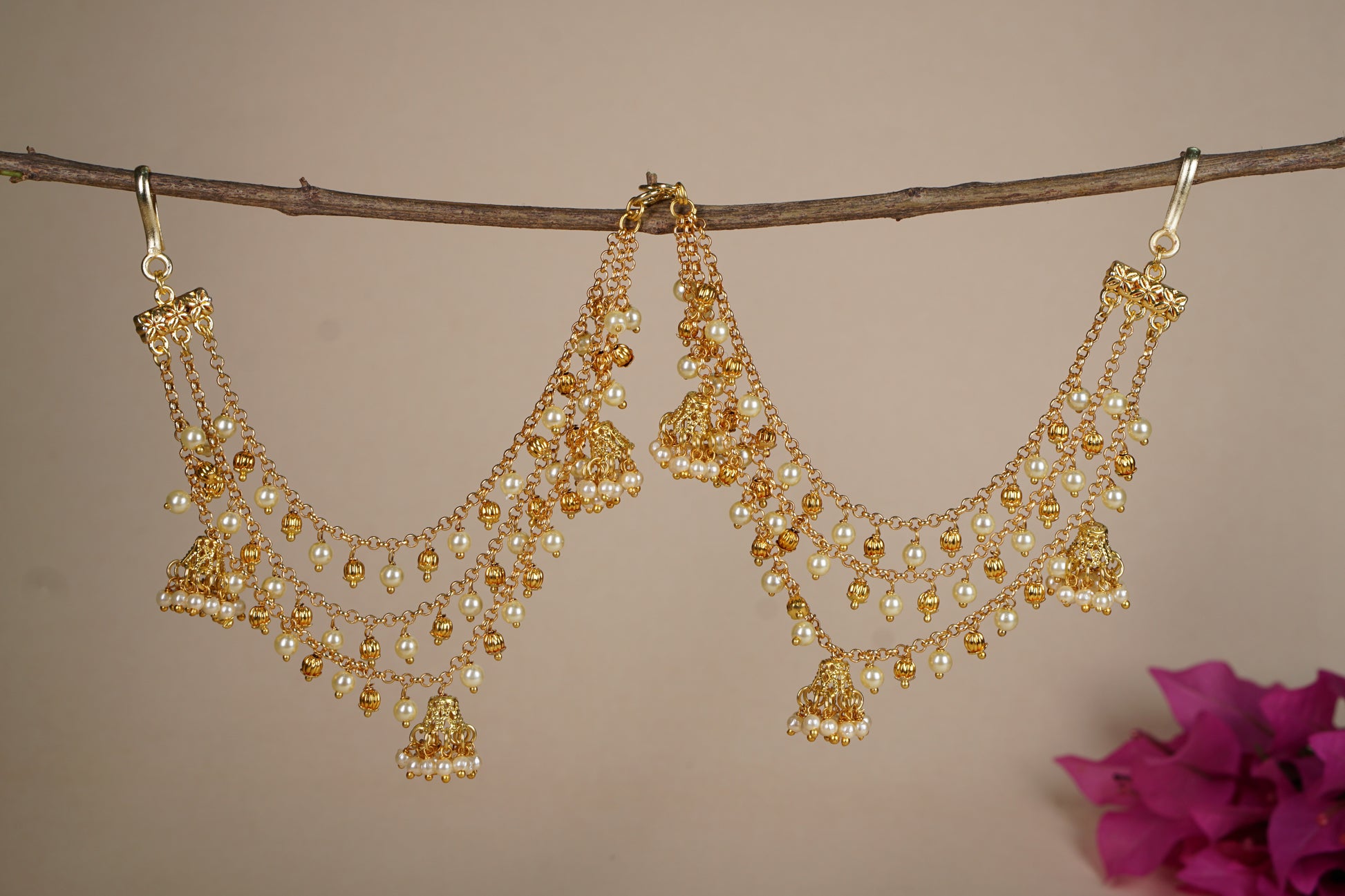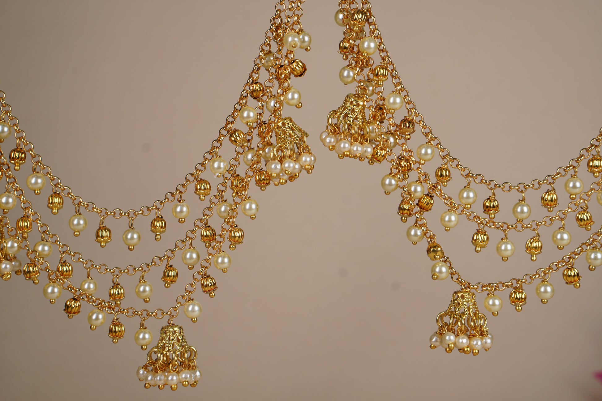 Attachment: A hairpin or clip mechanism to secure along the hairline, with matching danglers or studs for the earlobes.