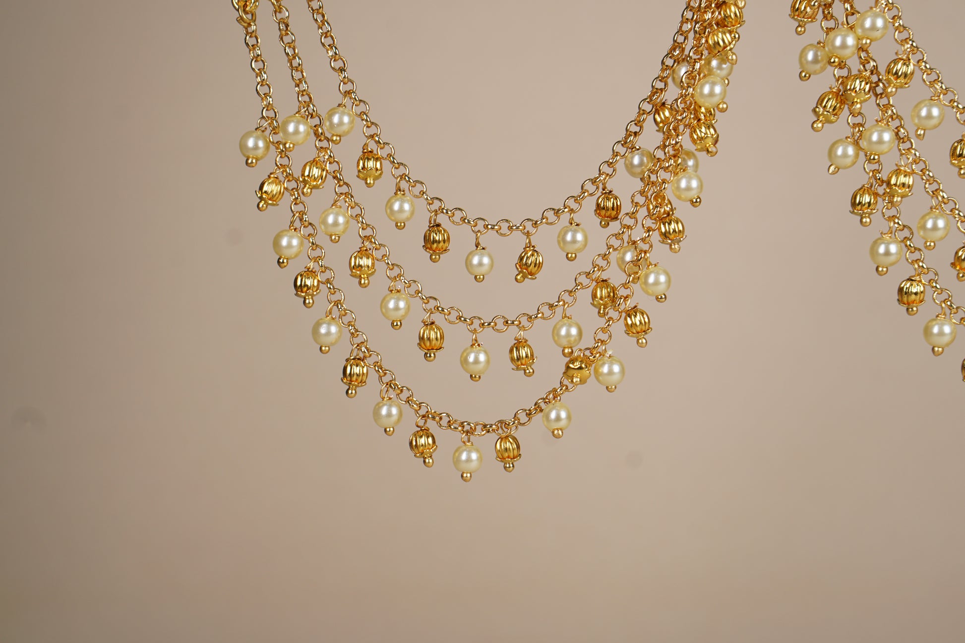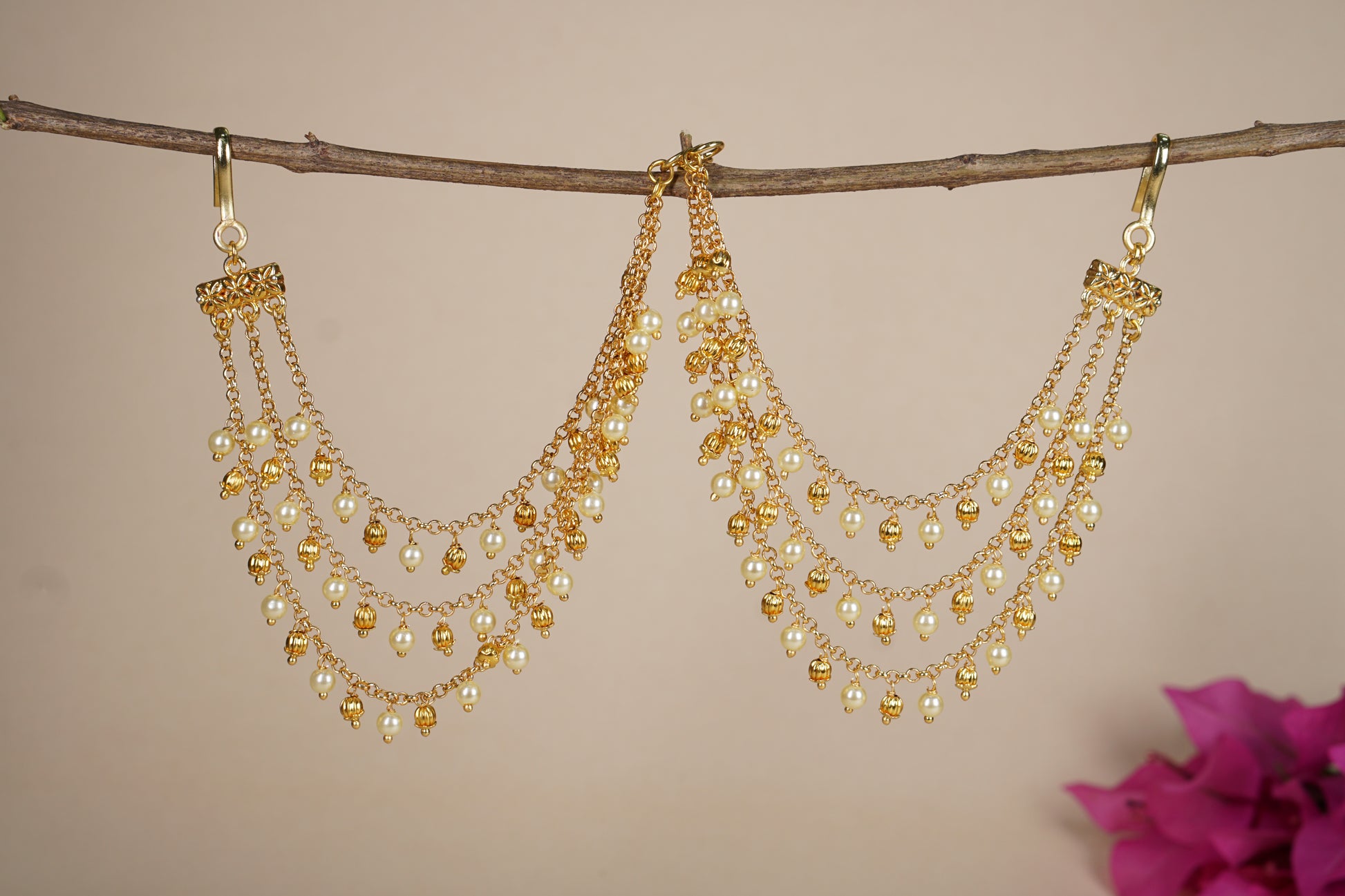 Attachment: A hairpin or clip mechanism to secure along the hairline, with matching danglers or studs for the earlobes.