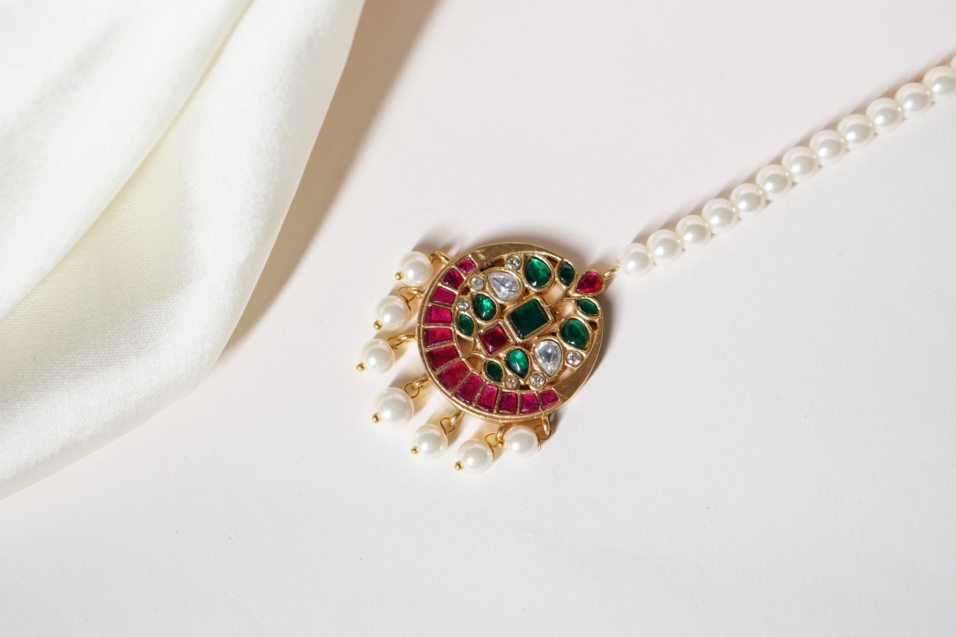 The maang tikka is a piece of jewelry that adorns the center parting of the hair and rests on the forehead. It typically consists of two main parts: