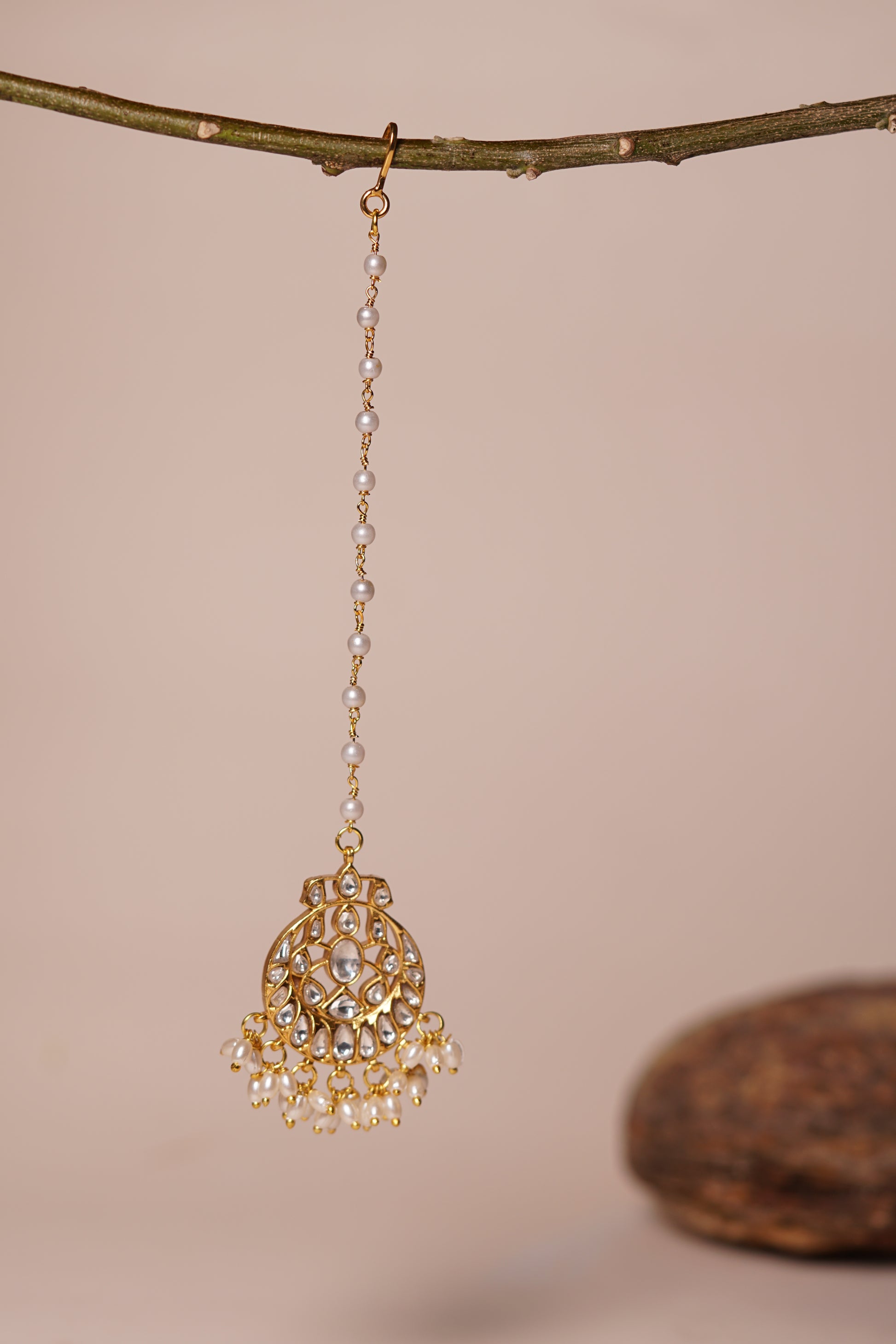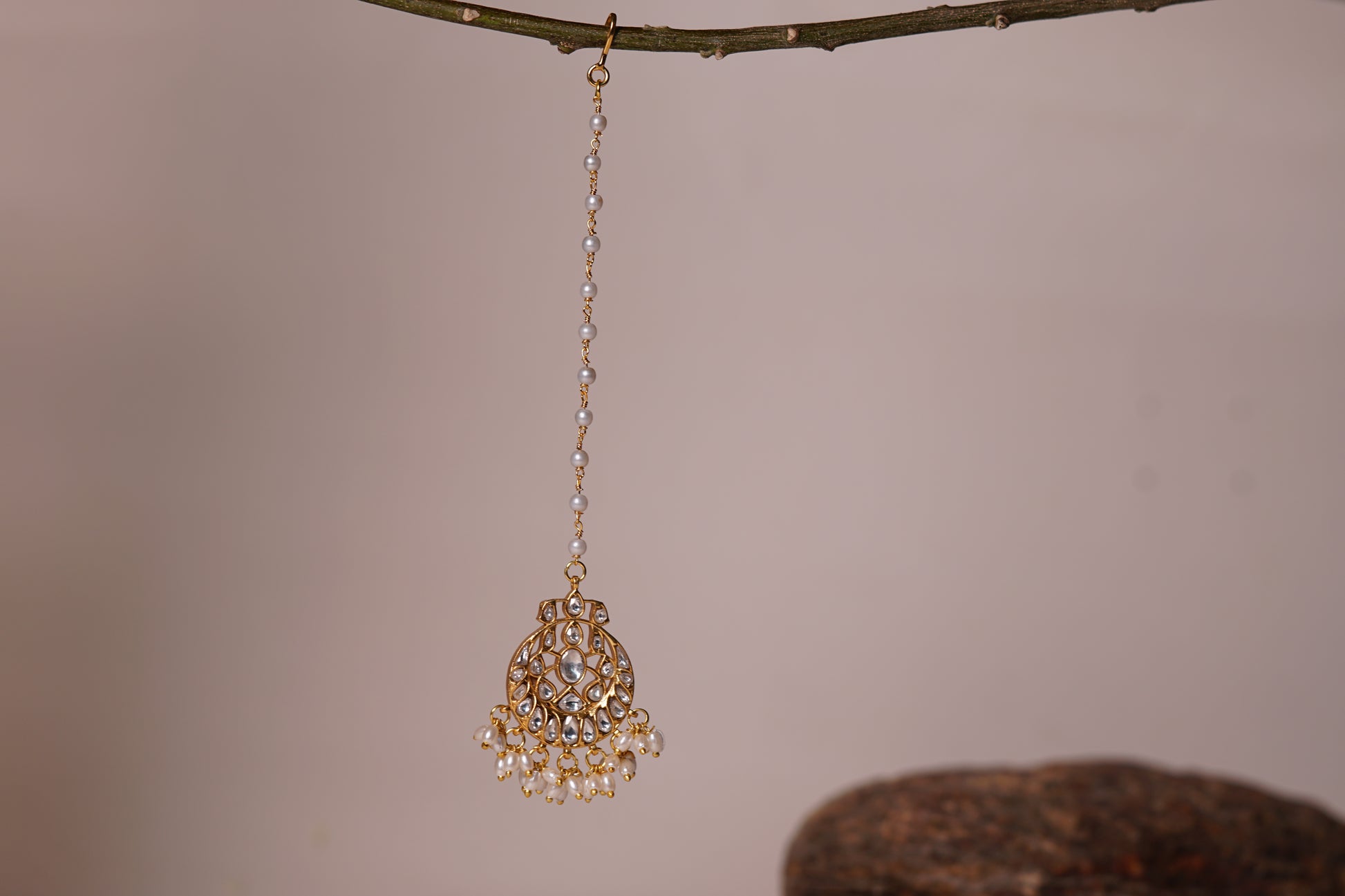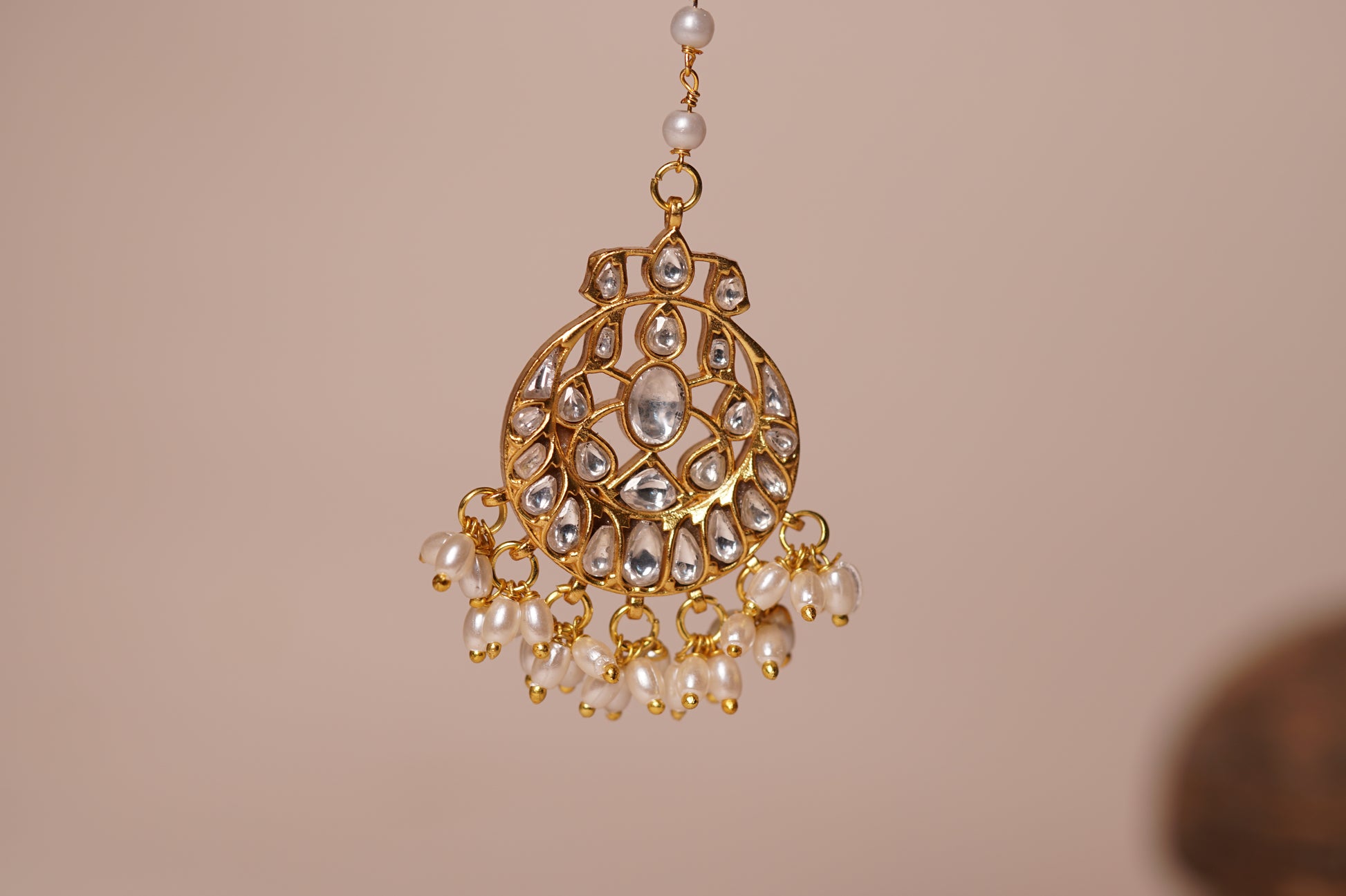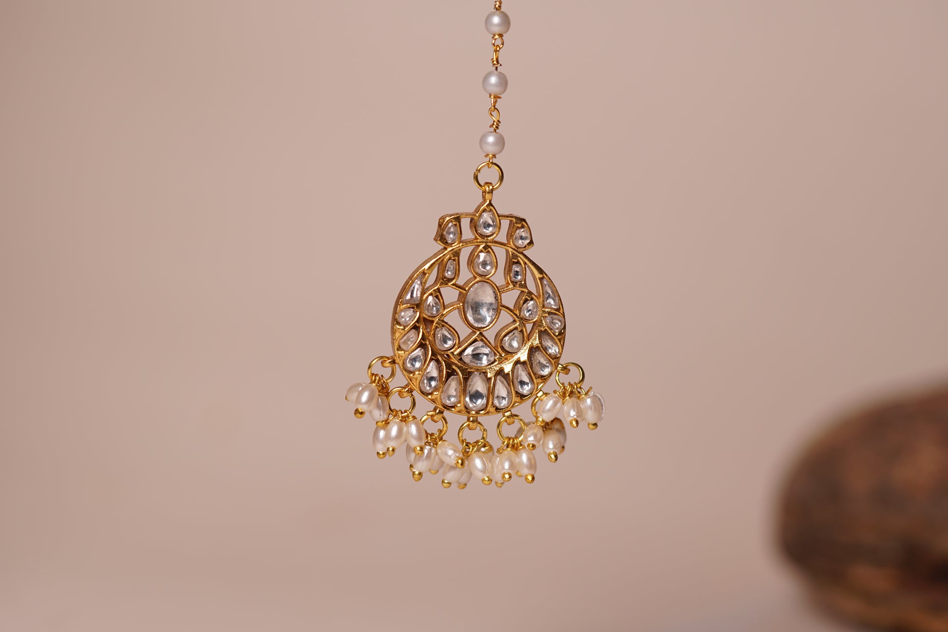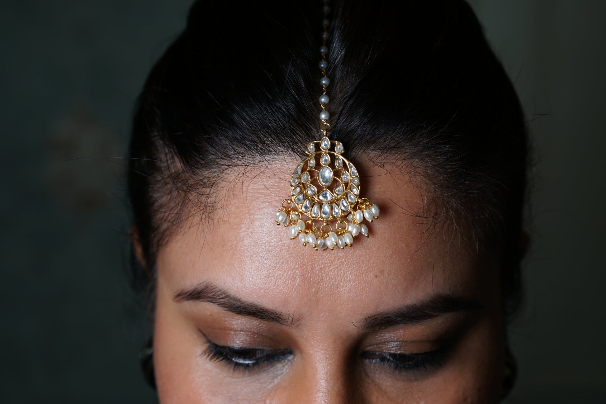 The maang tikka is a piece of jewelry that adorns the center parting of the hair and rests on the forehead. It typically consists of two main parts: