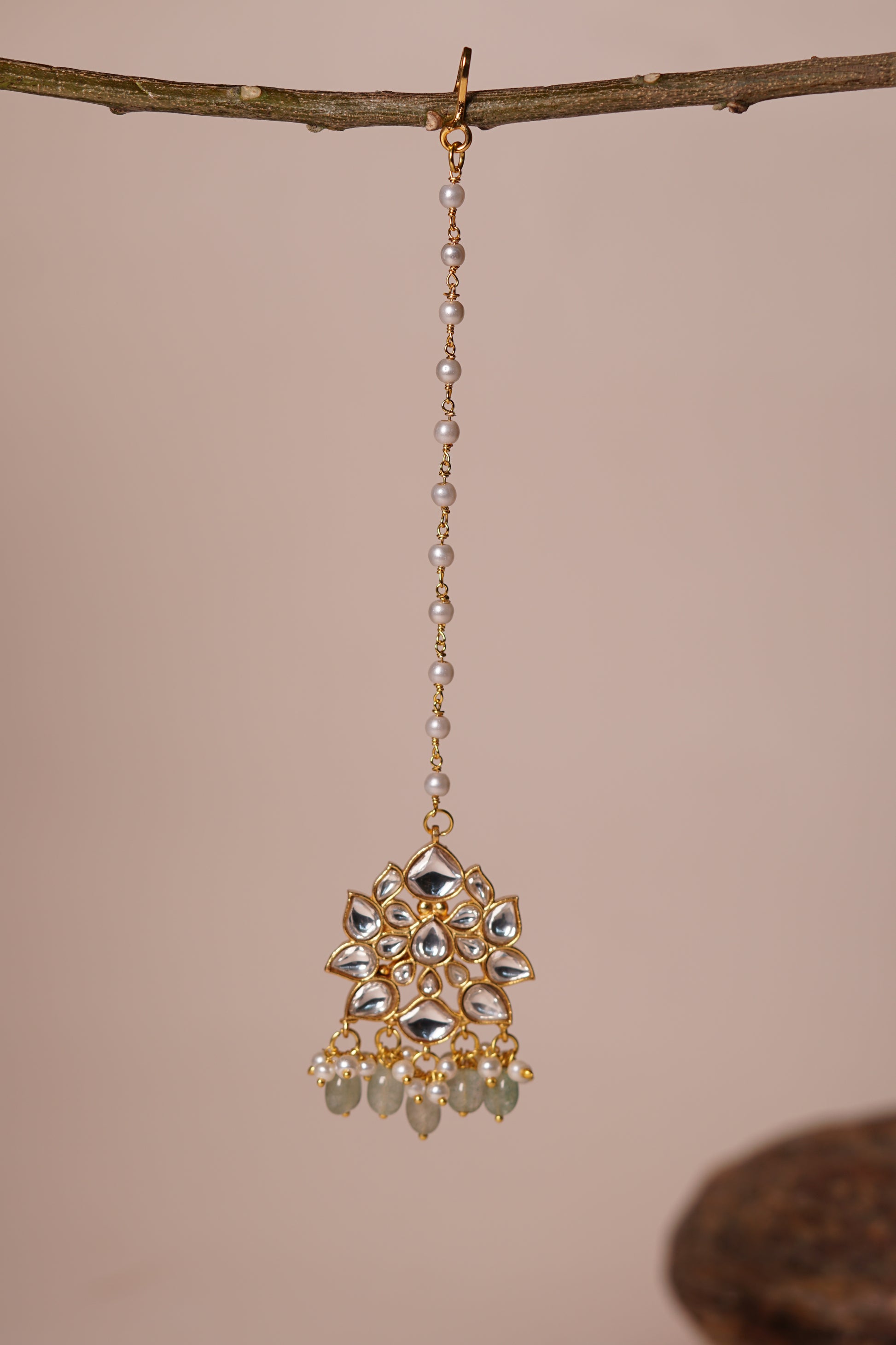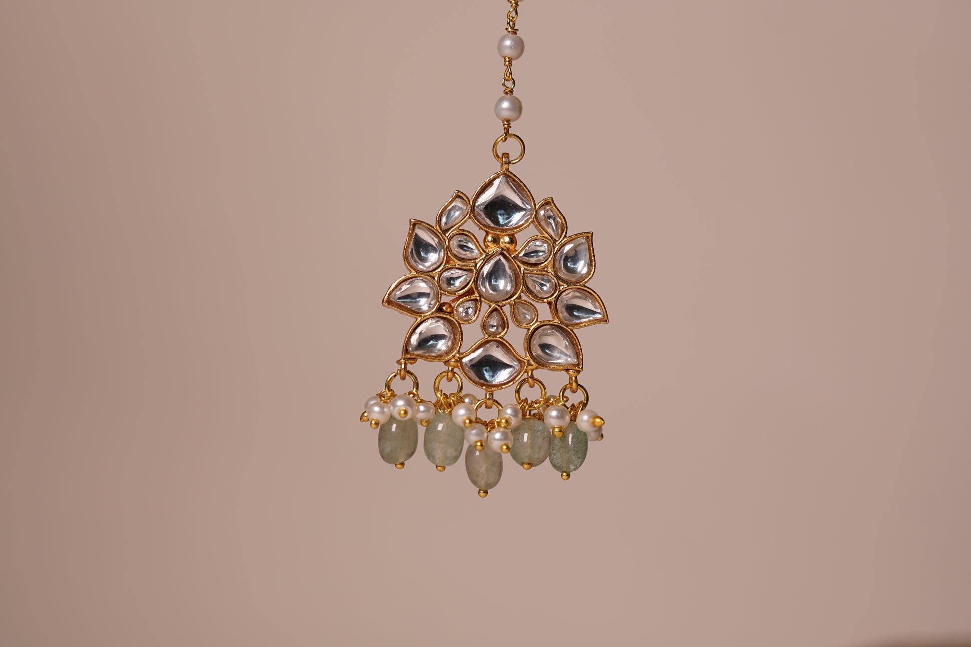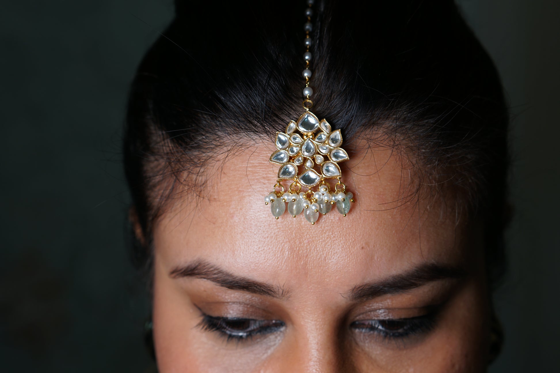 The maang tikka is a piece of jewelry that adorns the center parting of the hair and rests on the forehead. It typically consists of two main parts: