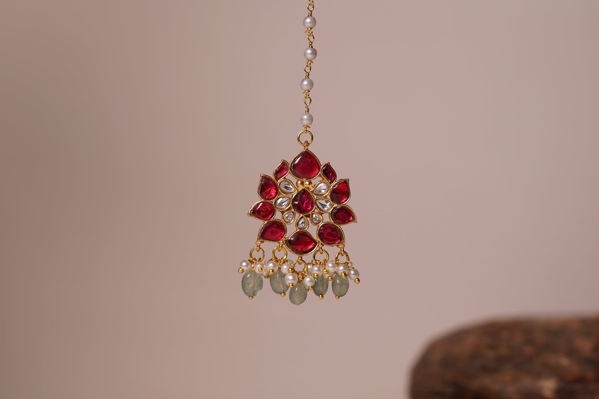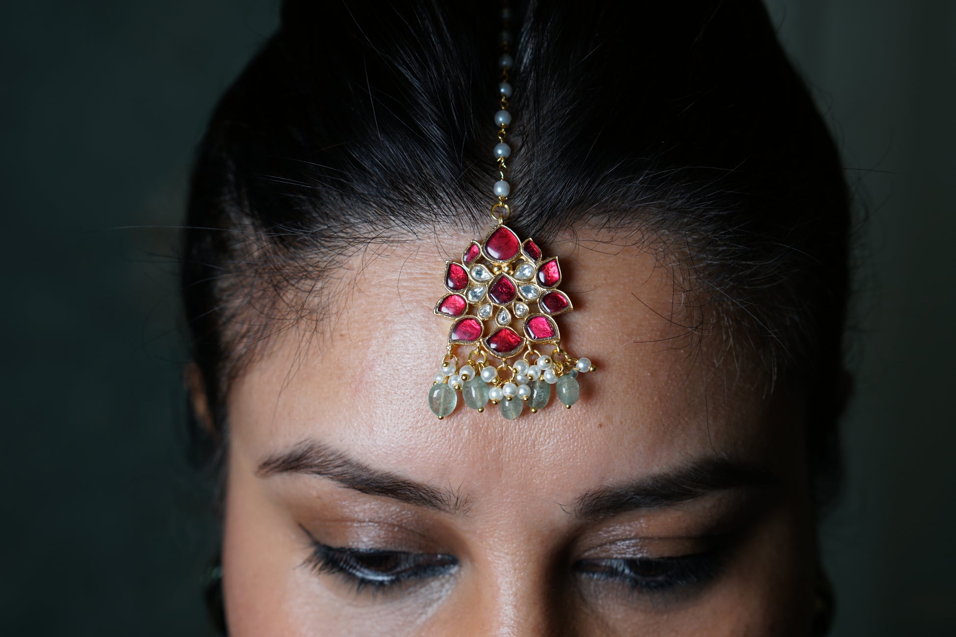 The maang tikka is a piece of jewelry that adorns the center parting of the hair and rests on the forehead. It typically consists of two main parts: