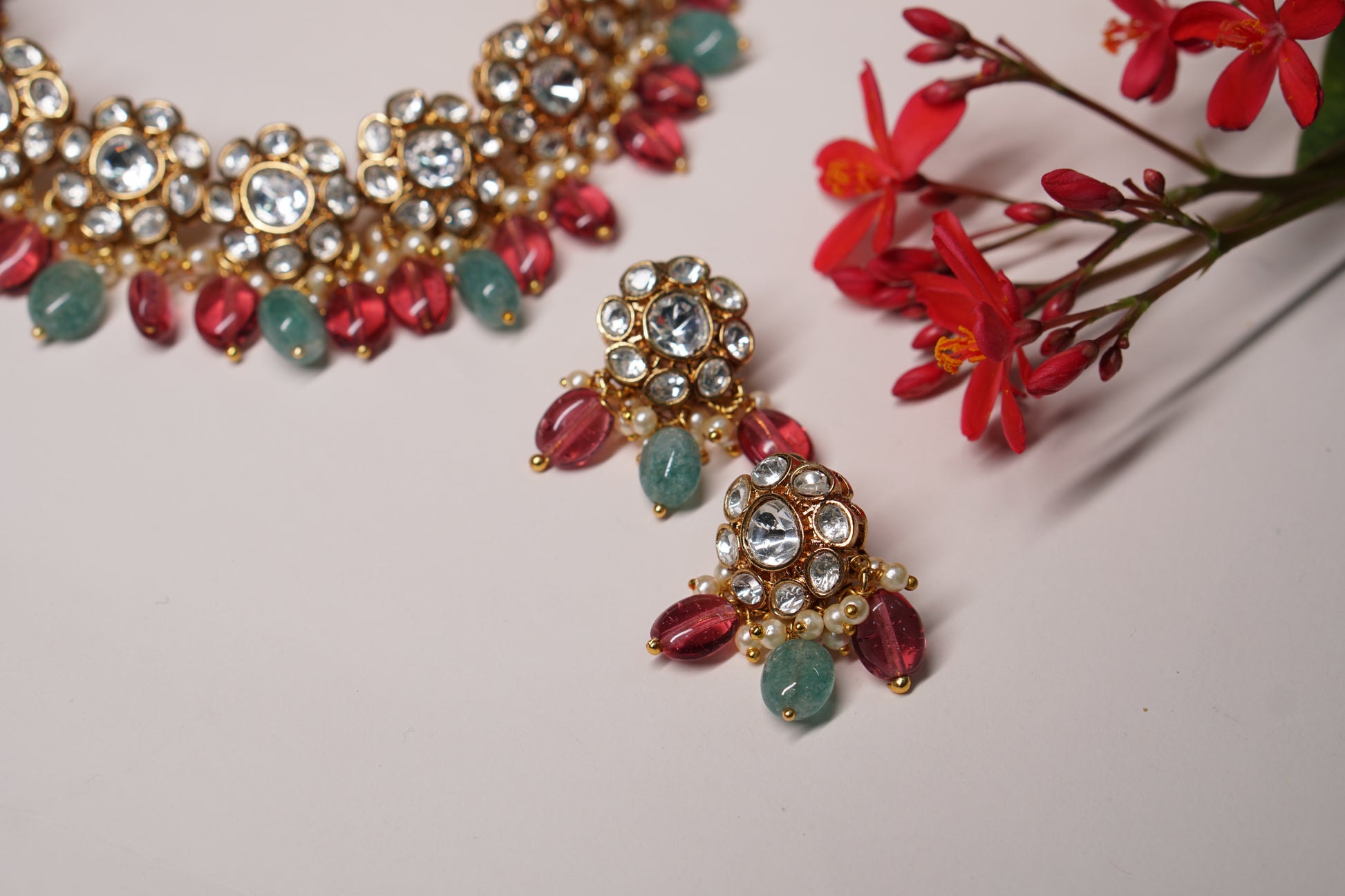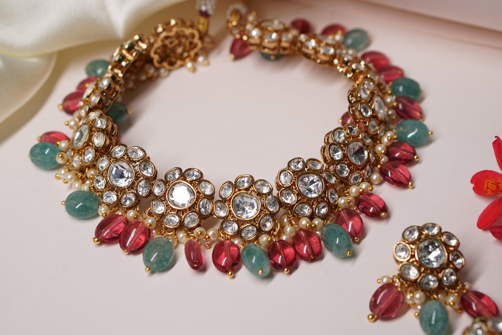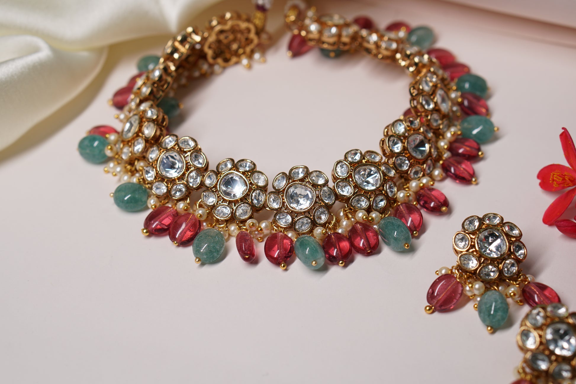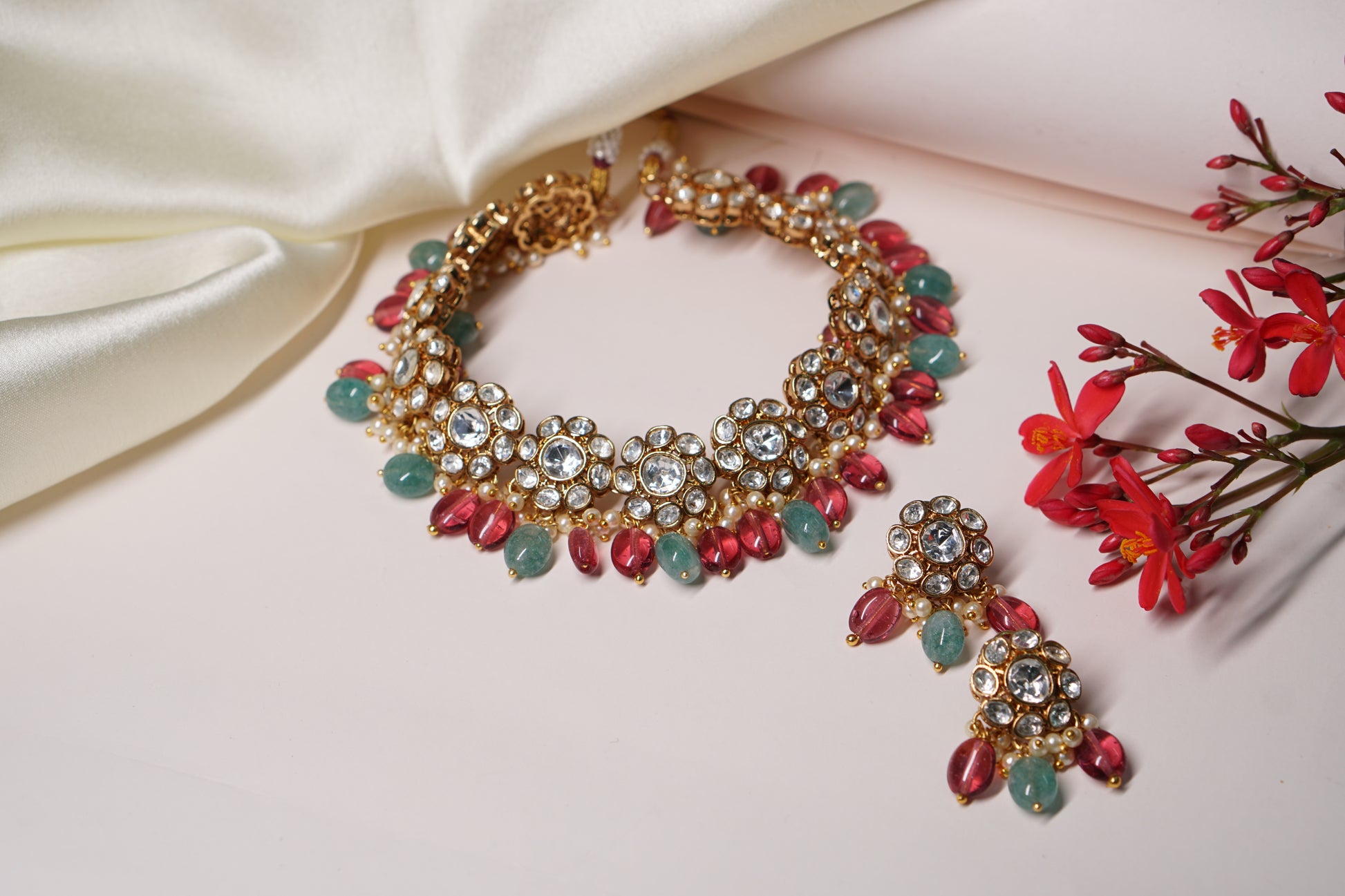 A Polki choker Set is a sophisticated jewelry ensemble, combining the allure of uncut diamonds with artistic design. The necklace set typically features Polki diamonds arranged in traditional motifs and patterns, often complemented with colorful gemstones or pearls for added elegance.