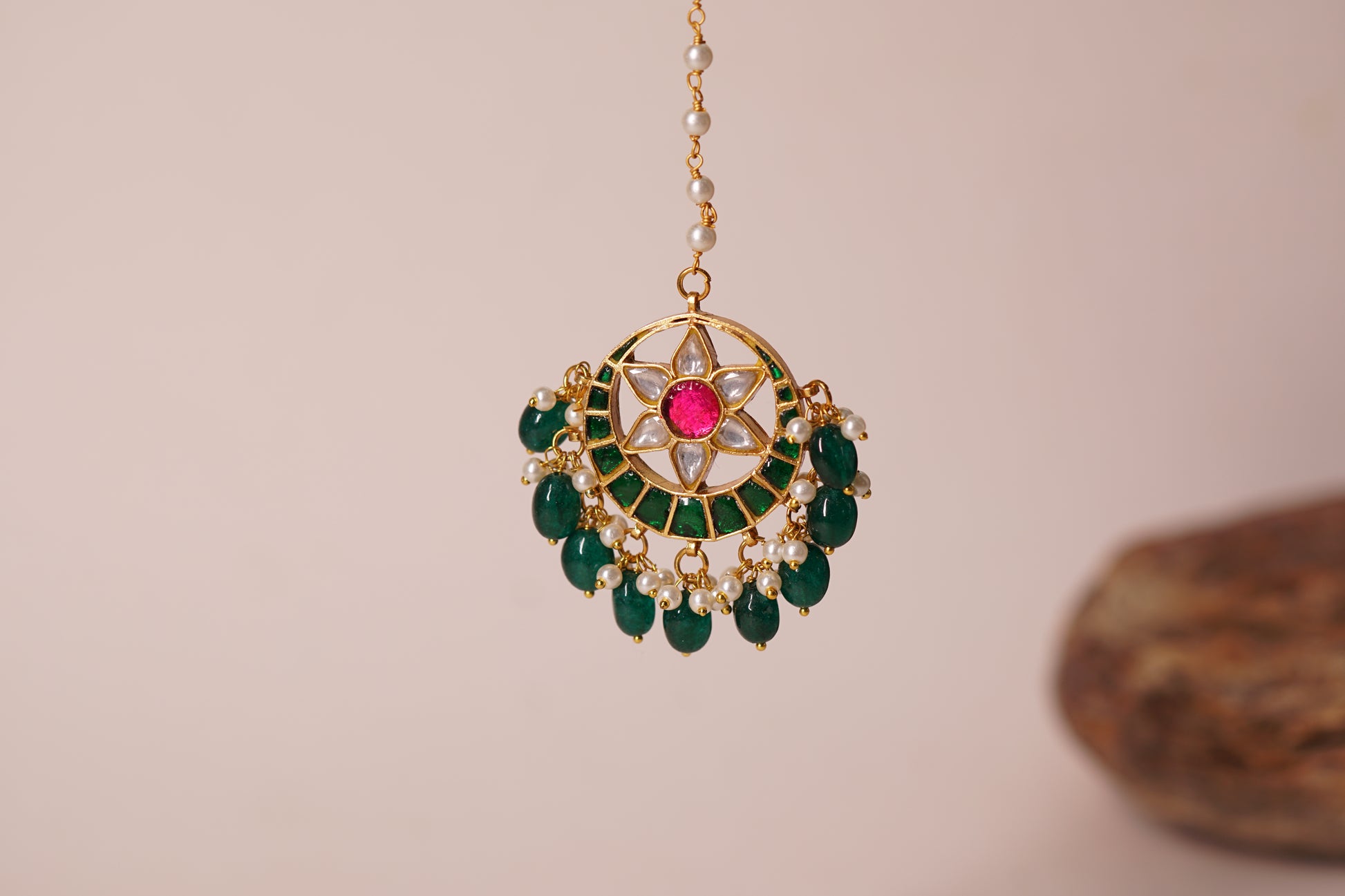 The maang tikka is a piece of jewelry that adorns the center parting of the hair and rests on the forehead. It typically consists of two main parts: