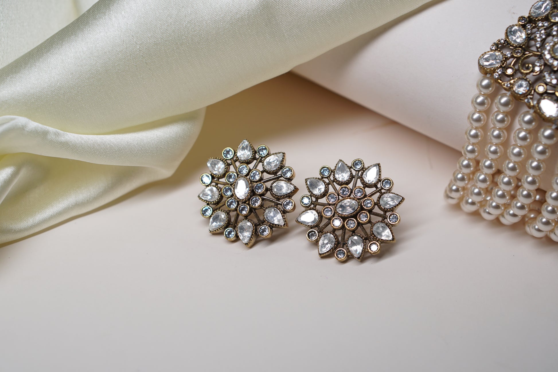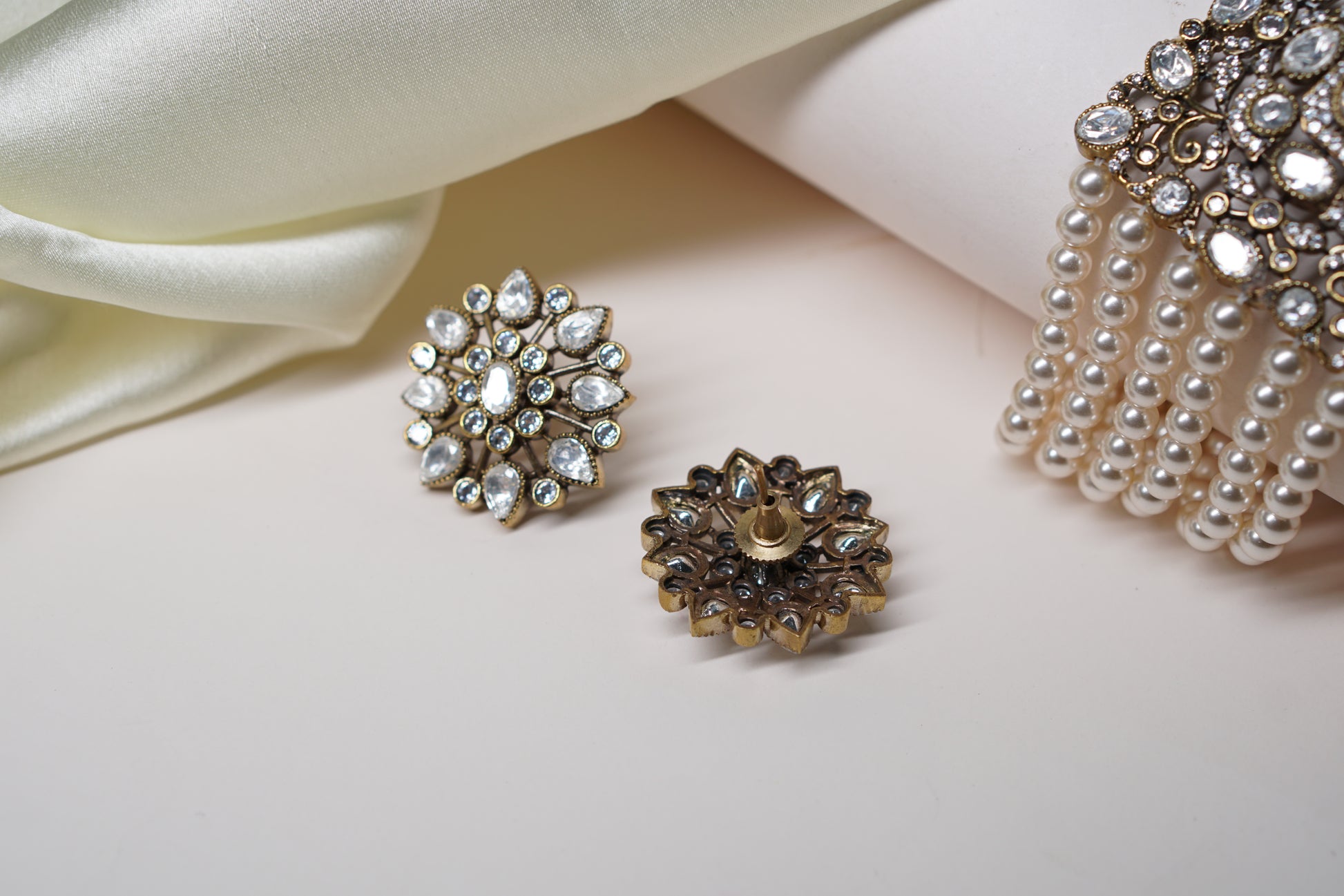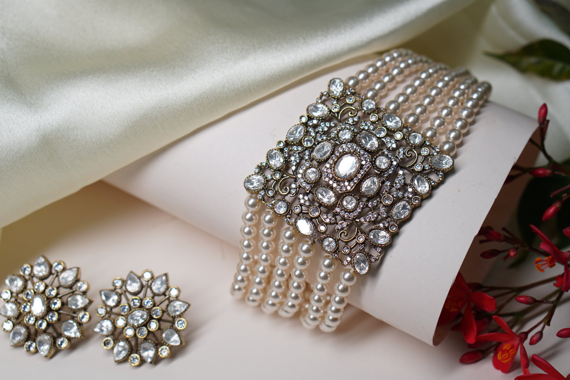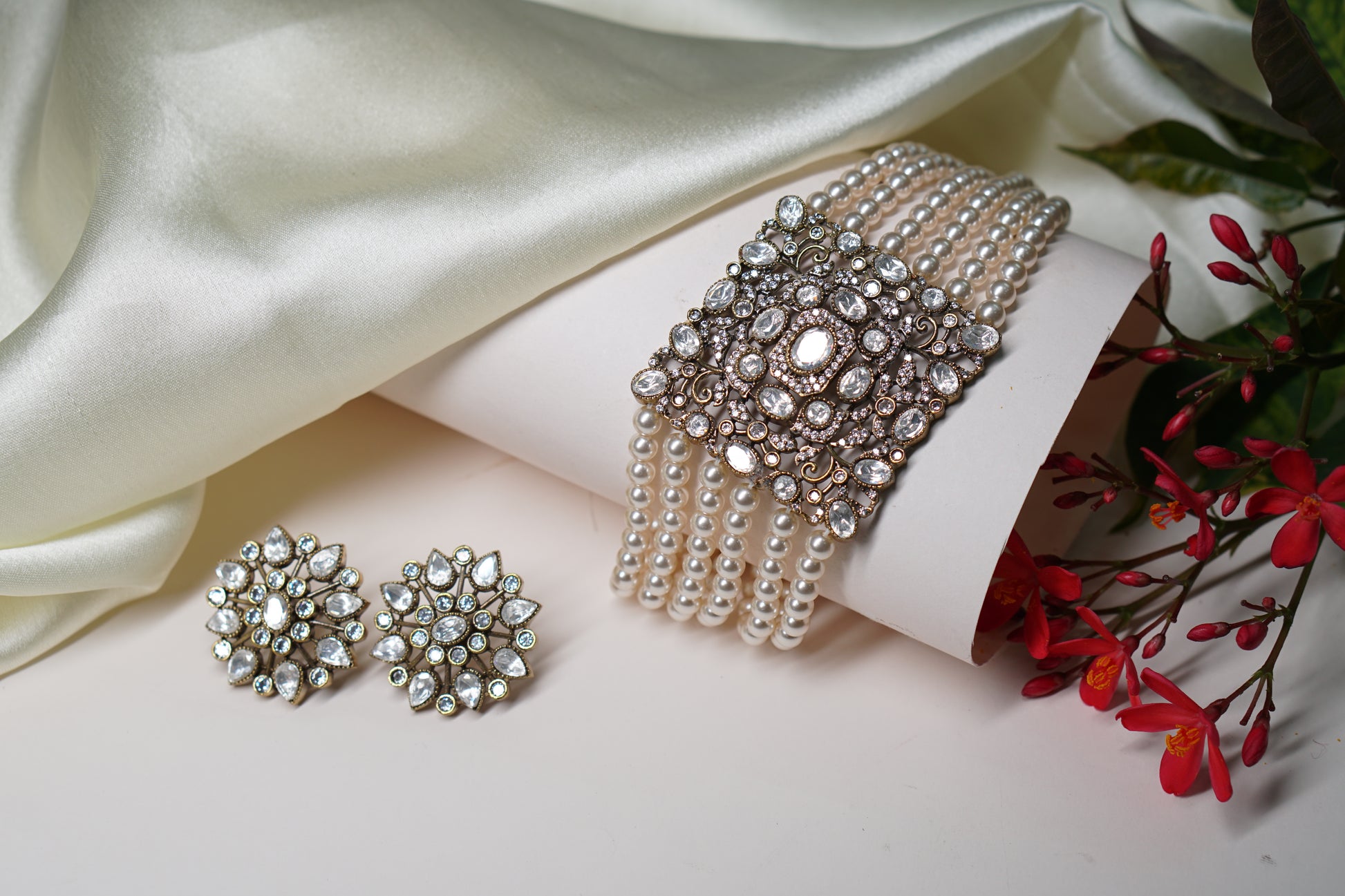 A Polki choker Set is a sophisticated jewelry ensemble, combining the allure of uncut diamonds with artistic design. The necklace set typically features Polki diamonds arranged in traditional motifs and patterns, often complemented with colorful gemstones or pearls for added elegance.