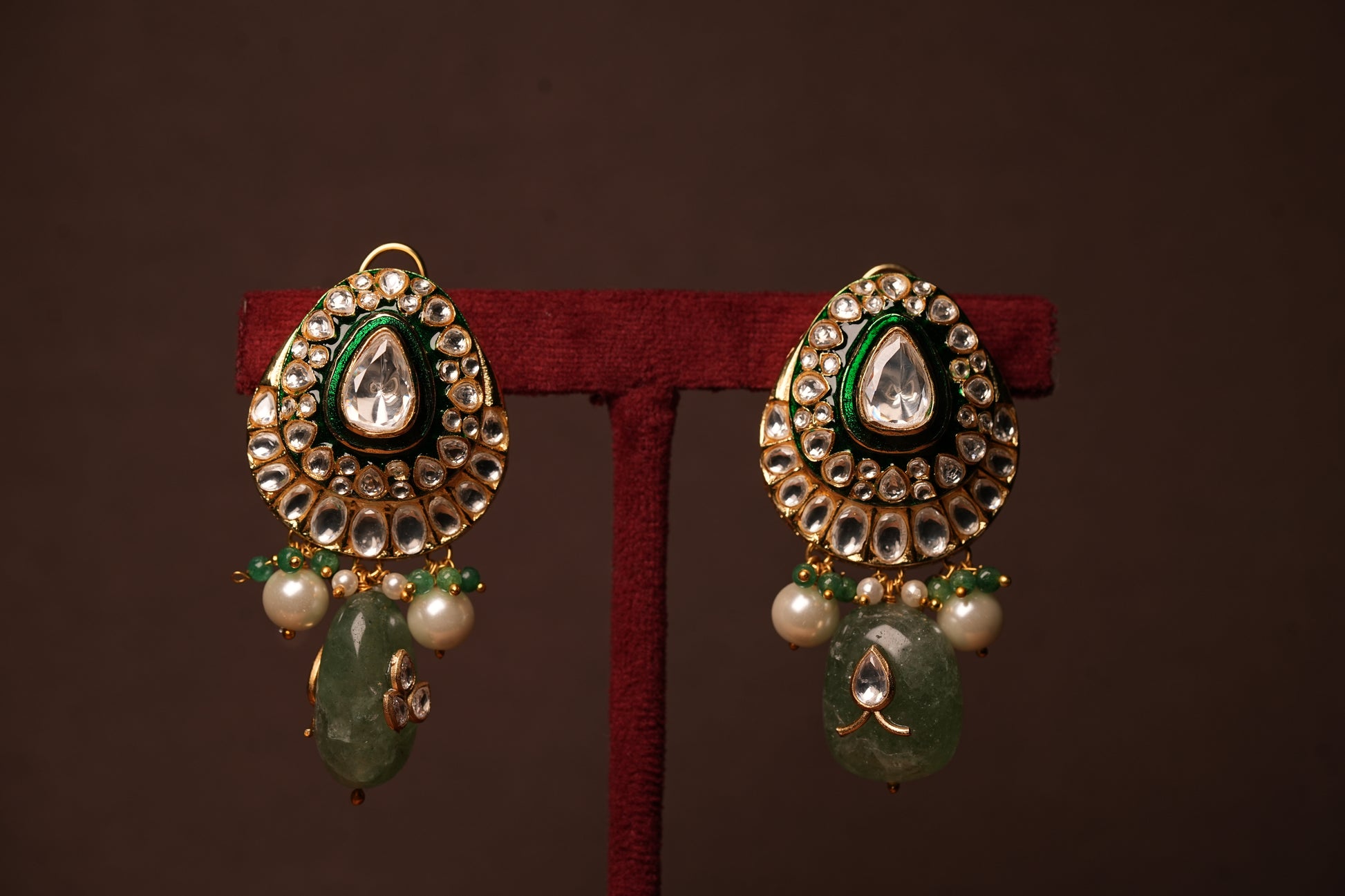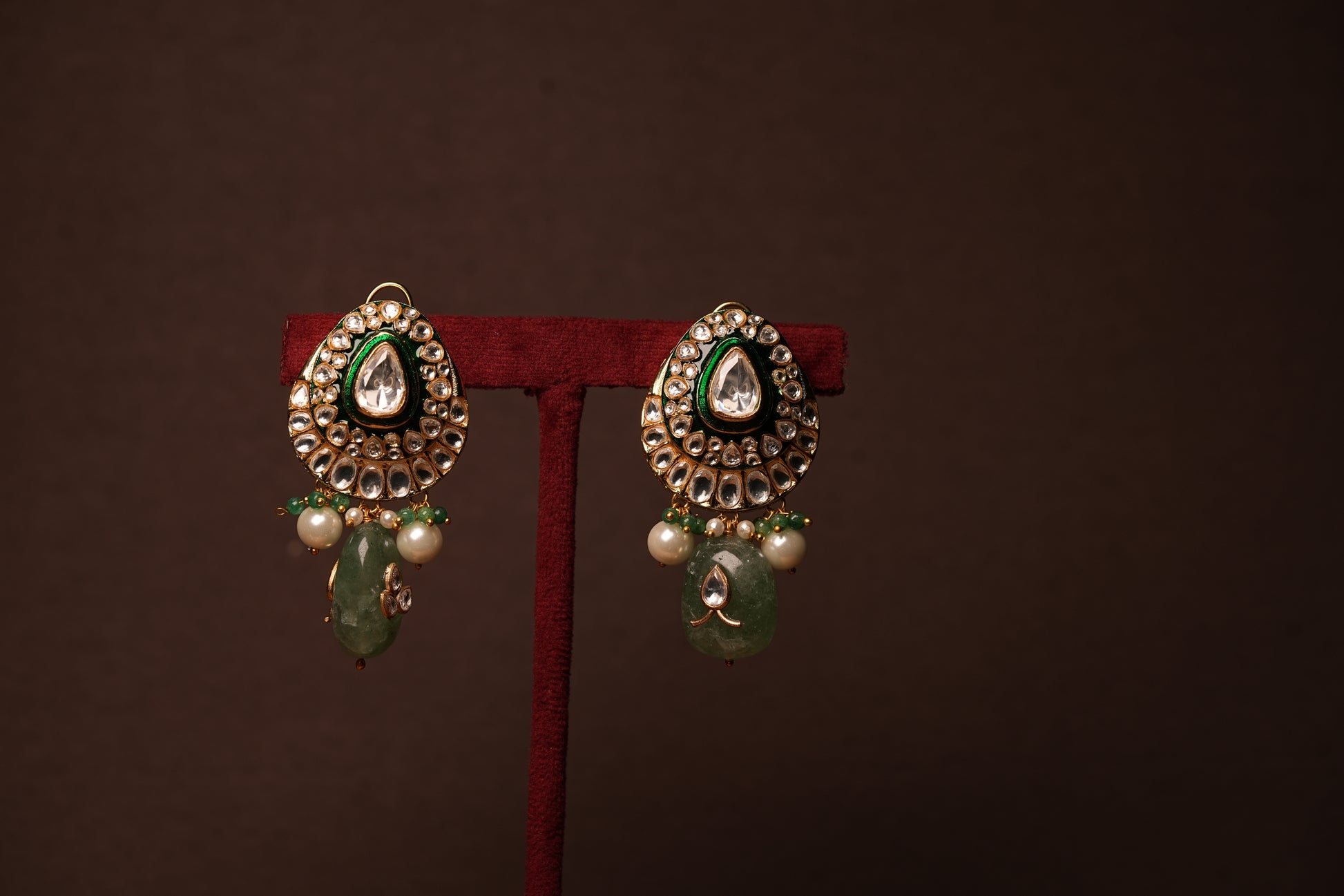polki earring jewelry is one of the oldest forms of Indian jewelry, dating back to the Mughal era. Polki diamonds are uncut, raw diamonds that retain their natural form and are prized for their unique, rustic charm. These diamonds are set in gold or silver and often paired with other gemstones like emeralds, rubies, or pearls to create stunning designs.