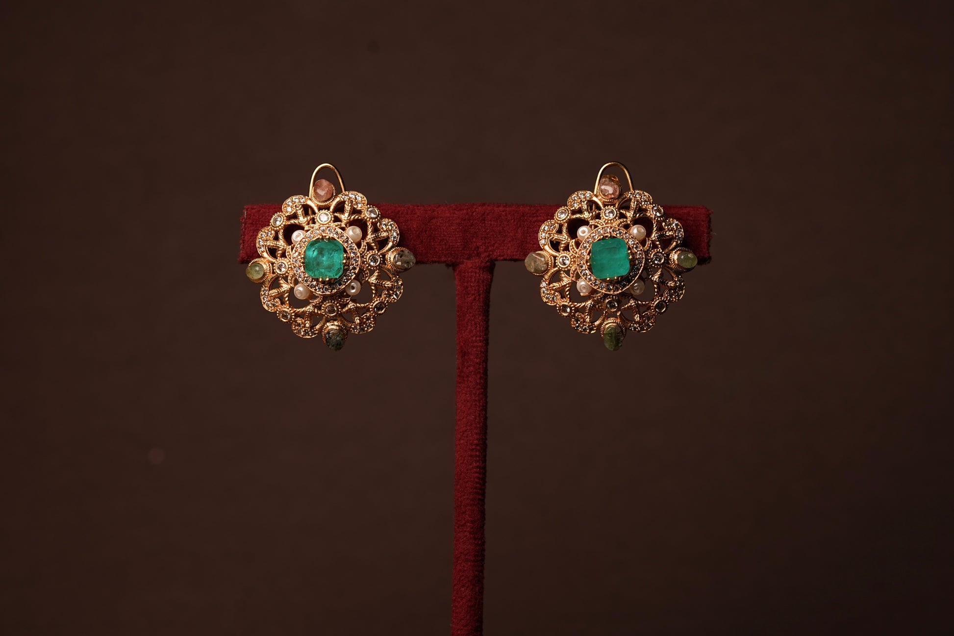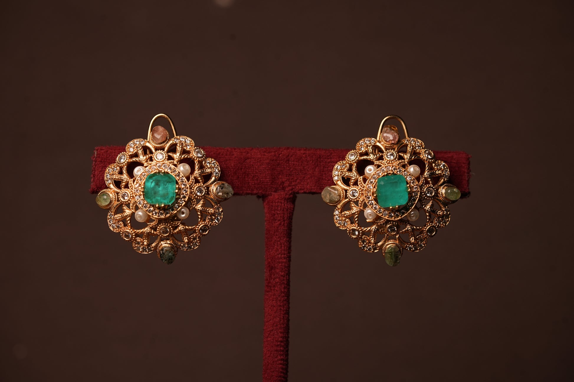 The design of Polki studs is often intricate, with many earrings incorporating motifs such as flowers, leaves, or geometric patterns. These studs can also be accented with other gemstones, pearls, or enamel work, which enhances their appeal and adds to their ornate look.